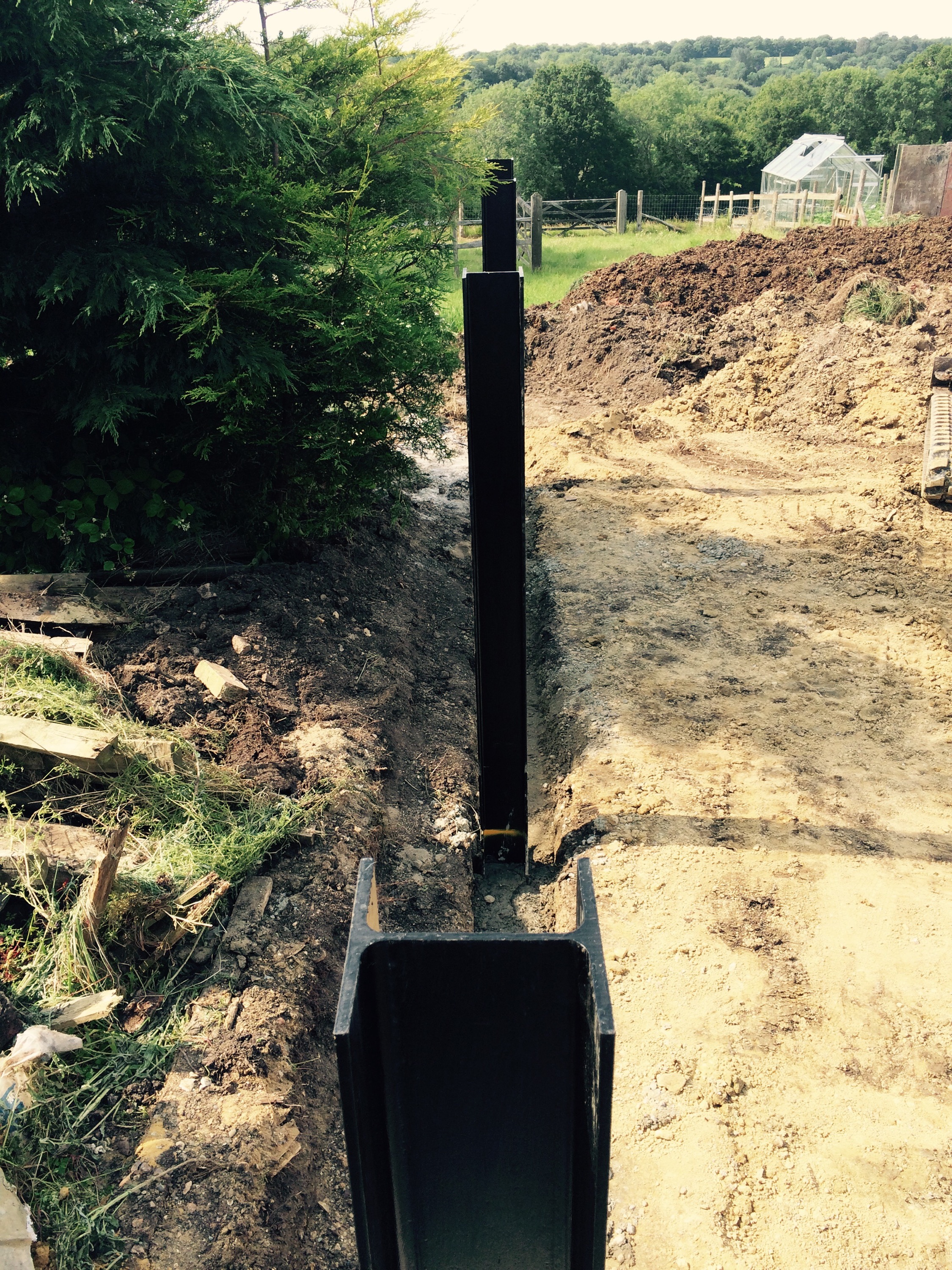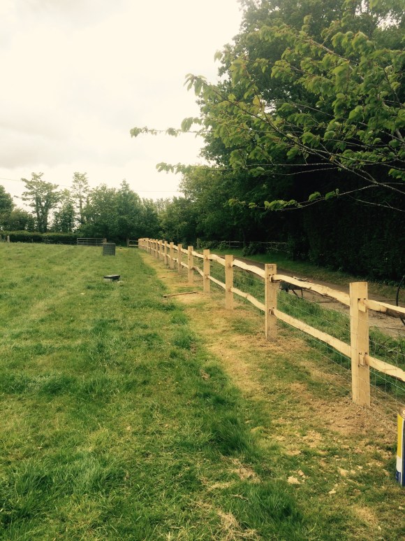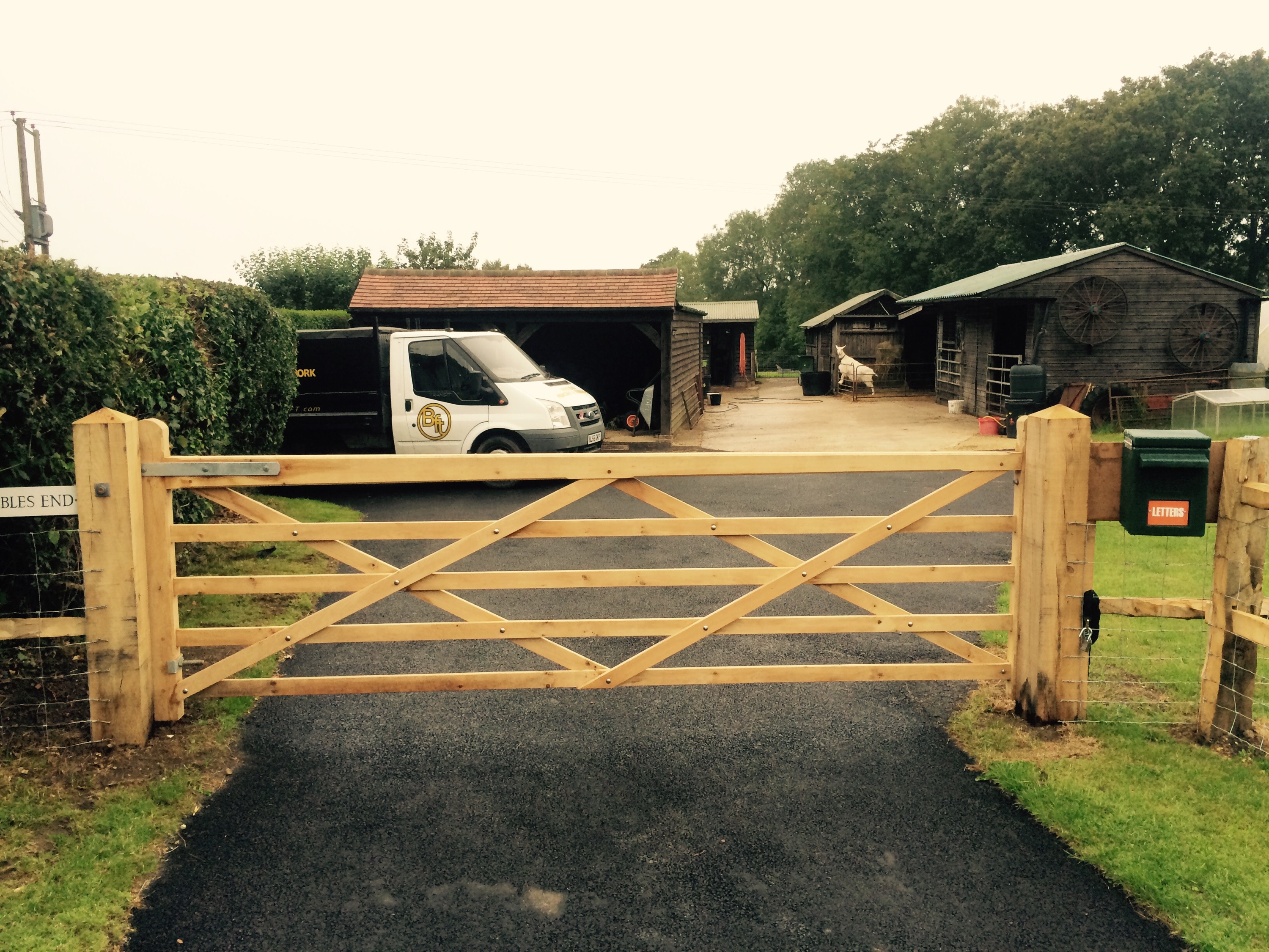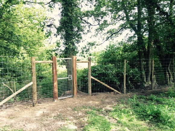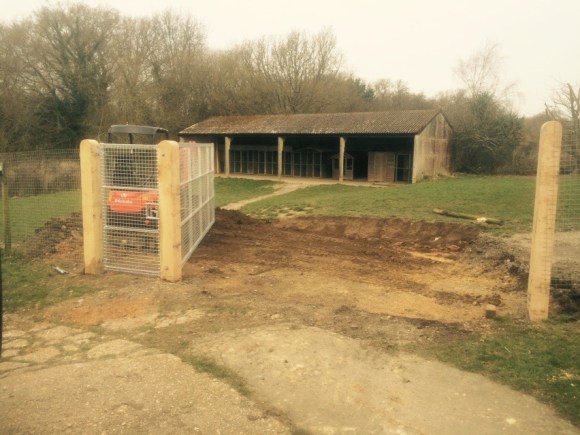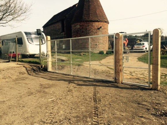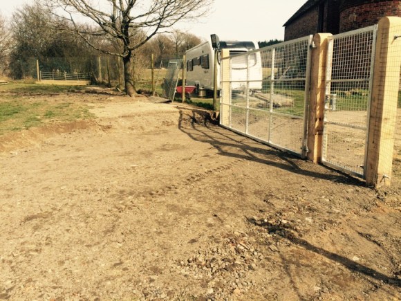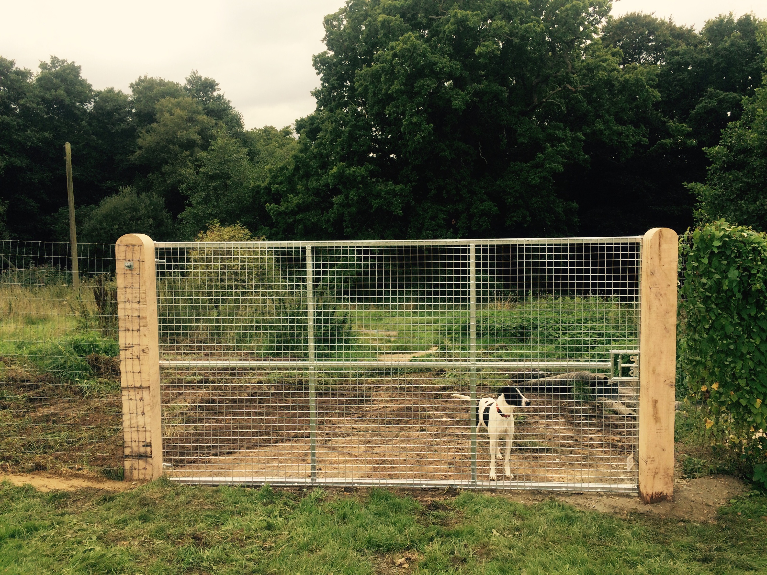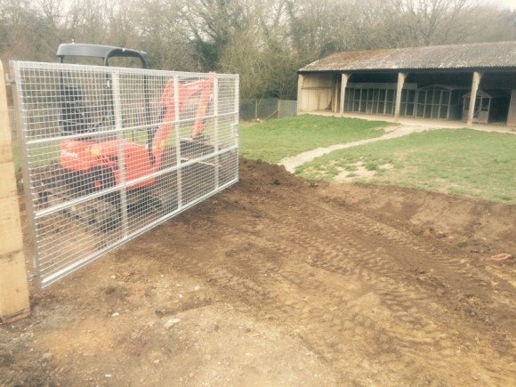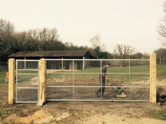 On this project the ground had to be dug out so that the gate could be hung level and flush with the ground so it’s secure for dogs. Galvanised gates hung on 3m oak posts